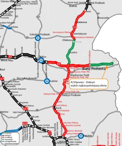 Prawie 460 milionów złotych wynosi wartość najkorzystniejszej oferty w postępowaniu przetargowym na zaprojektowanie i budowę ponad dziewięciokilometrowego odcinka autostrady A2 między węzłem Kijowiec a węzłem Dobryń. To kolejny etap rozbudowy trasy na wschód od Białej Podlaskiej, który w przyszłości usprawni dojazd m.in. do terminala samochodowego w Koroszczynie, obsługującego ruch w kierunku granicy państwa.