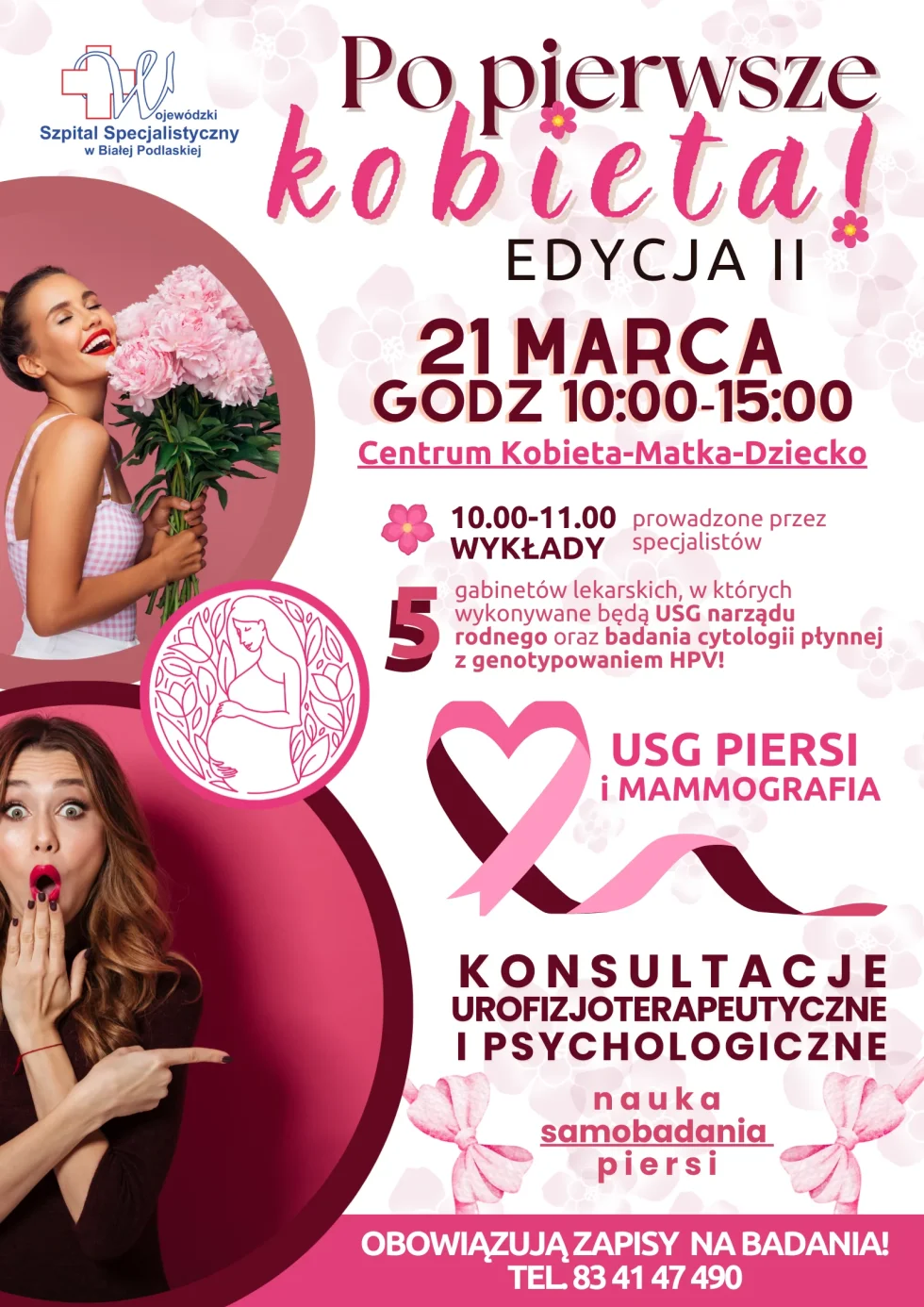 Bezpłatne badania, konsultacje ze specjalistami oraz spotkania edukacyjne - tak zapowiada się wydarzenie profilaktyczne „Po pierwsze Kobieta”, które odbędzie się 21 marca w Białej Podlaskiej. Organizatorzy zachęcają mieszkanki miasta i całego regionu do skorzystania z możliwości wykonania ważnych badań diagnostycznych.